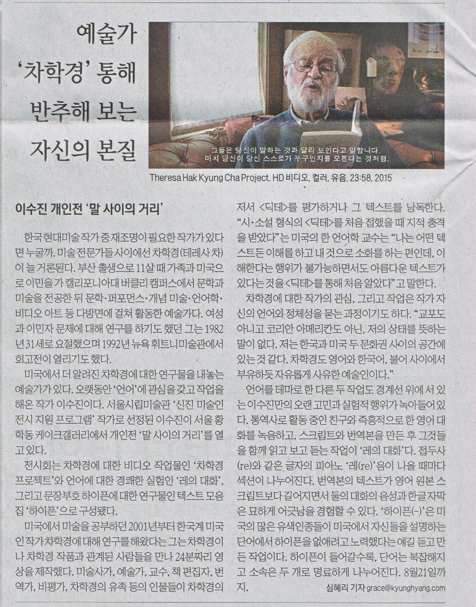 *Correction: Theresa Hak Kyung Cha Project was not a commissioned project for the exhibition "A Portrait in Fragments: Theresa Hak Kyung Cha 1951-1982" even though both Paul O'Kane's and Bea de Souza's texts incorrectly refer the project as a commissioned one. Theresa Hak Kyung Cha Project was independently funded and produced by Sujin Lee.