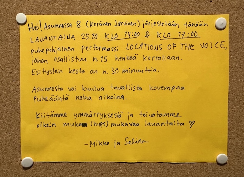Locations of the Voice premiered in Jyväskylä, Finland, on October 25, as part of Art without Transportation, an art initiative by Äkkigalleria (Anna Ruth and Juho Jäppinen).
