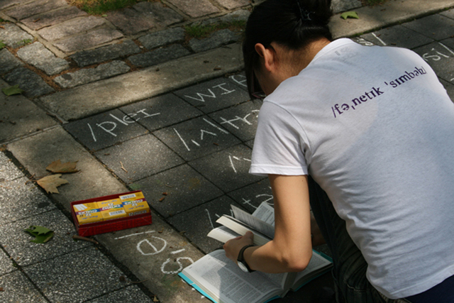 Lee writes on the concrete ground of the park with a white chalk, using the phonetic symbols from the Longman Dictionary of Contemporary English (Second Edition). Copies of a phonetic symbol table are available for the audience’s reference. When the audience reads the text that’s written on the ground, he/she performs the act of translating written text to spoken text through the rules of pronunciation which may not be familiar to him/her (i.e. phonetic symbols). Therefore, his/her speech often staggers. The dictionary that the artist uses features both British and American English pronunciations and she alternates between them.