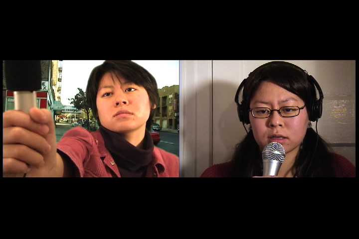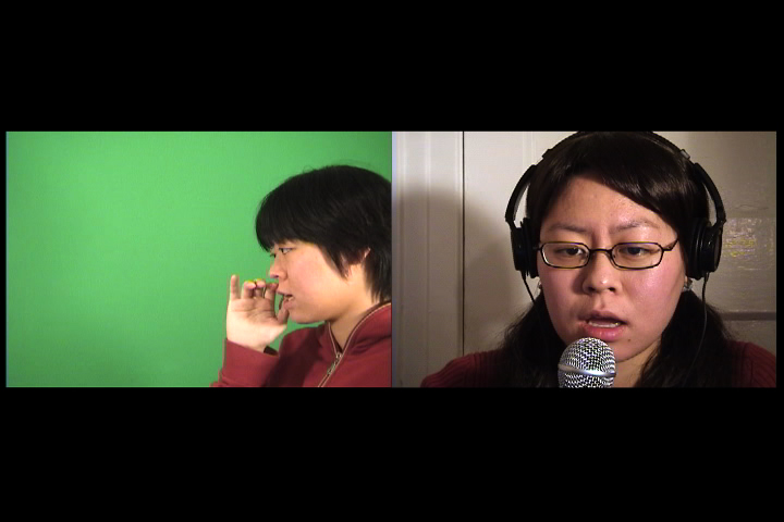 She is a girl who speaks for herself In a split screen, one video presents Speech Girl making observations about herself and her speech while the other video presents Dubbing Girl dubbing over Speech Girl's words. The silences and pauses within Speech Girl’s speech are replaced by the anxiety and anticipations of Dubbing Girl.